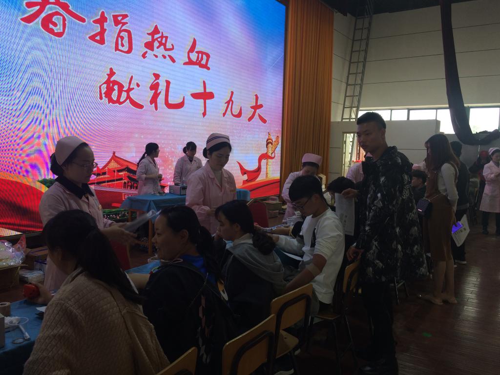 10月25日下午,阳光明媚,在全国上下欢庆党的十九大顺利闭幕、十九届一中全会顺利召开之时,学工部(处)主动联系孝感市中心血站在西区大学生活动中心开展以“欢庆十九大 永远跟党走”为主题的无偿献血活动。此次爱心献血活动吸引了广大师生的踊跃参与,参加献血的师生共计有836人,创造了学校单日献血的最高纪录,另有200多名师生的献血预约留待下周进行。