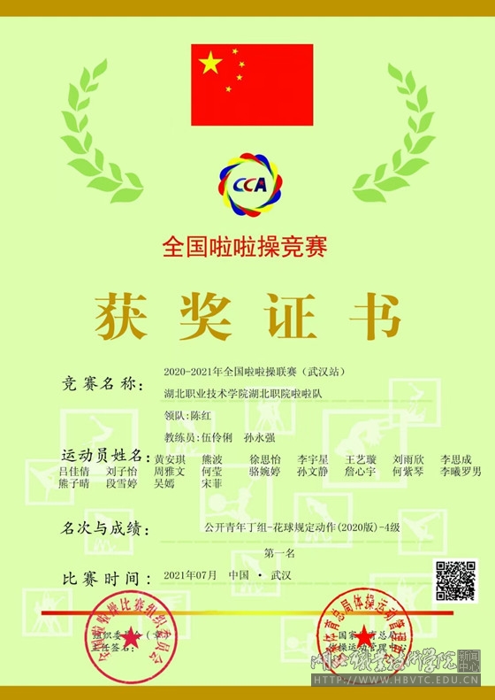 (本网通讯员:孙永强)2020-2021年全国啦啦操联赛(武汉站)日前圆满落下帷幕,beat365代表队以第一名的成绩荣获公开青年丁组花球规定动作(2020版)冠军,公开青年丁组-花球校园啦啦操示范套路第三名的优异成绩,学校体育部教师孙永强、伍伶俐作为指导教练荣获“优秀教练员”称号。