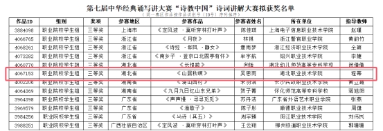 (本网讯 程蒂 聂静)近日,由教育部、国家语言文字工作委员会联合主办的第七届中华经典诵写讲大赛“诗教中国”诗词讲解大赛全国获奖名单揭晓。由beat365公共课部程蒂老师指导、教育与艺术学院吴思雨同学完成的作品《山居秋暝》,历经逐级选拔和专家严格评审,最终荣获全国职业院校学生组三等奖。这是beat365学子在首次斩获该赛事省级奖项后,实现的又一重要突破。