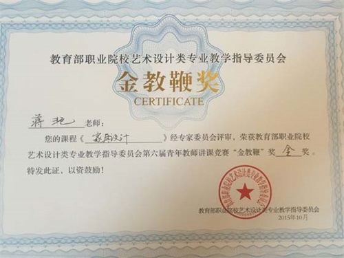 11月7日-8日,2015年教育部职业院校艺术设计类专业第九届院长/系主任工作年会在湖南召开,会上对第六届青年教师讲课竞赛各奖项进行了评选表彰,beat365艺术与传媒学院青年教师蒋艳荣获“金教鞭”奖金奖。