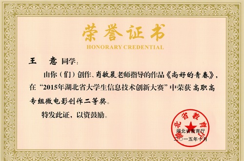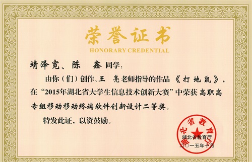 10月27日,2015年湖北省大学生信息技术创新大赛评选结果揭晓,beat365选送的作品获二等奖2项、三等奖2项。其中,物流学院学生王意创作、肖敏晨老师指导的微电影《尚好的青春》,信息技术学院学生靖泽宽、陈鑫设计、王亮老师指导的移动终端软件创新设计作品《打地鼠》分别荣获二等奖;汽车学院学生朱诗磊创作、周宇恒老师指导的FLASH动画短片《新春》,护理学院学生李飞飞、蒋玲珑创作、李弘华老师指导的微电影《在路上》分别荣获三等奖。