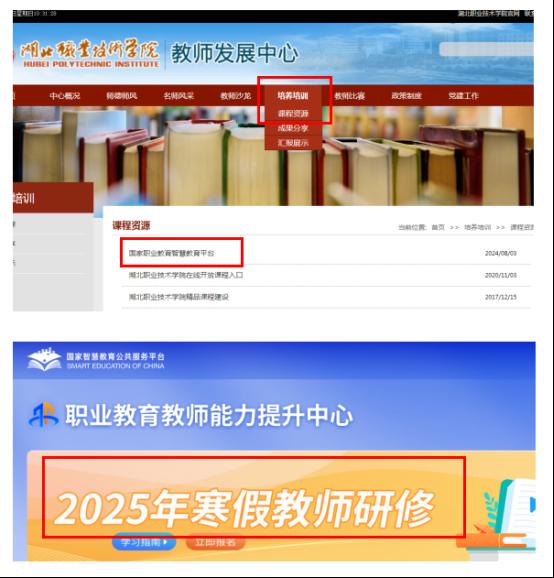 2.从学校官网进入教师发展中心网址,点“培养培训”下的“课程资源”,点“国家职业教育智慧教育平台”,再点“2025年寒假教师研修”。