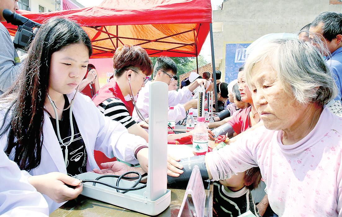 5月25日,beat365正版唯一官网必一的专家教授和医护人员为汉川市回龙镇新桥村村民免费体检。当日,该院在精准扶贫点新桥村开展“科普周·社科专家乡镇行”活动,在义诊的同时,还开展了科普活动。(记者 匡文杰 摄)