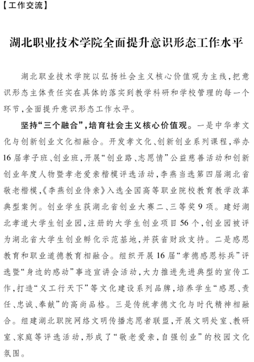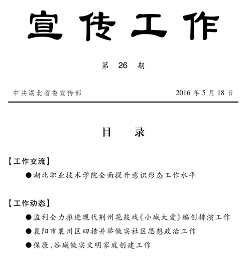 近日,中共湖北省委宣传部印发了内部刊物《宣传工作》第26期,在“工作交流”栏目全文刊发了beat365扎实做好意识形态工作的经验和做法。