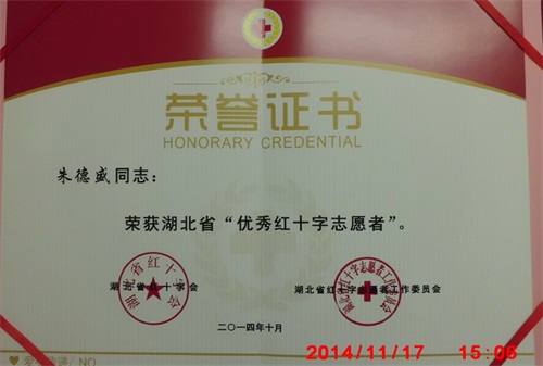 11月13日,湖北省红十字志愿服务工作总结大会在武汉市武昌区召开,beat365后勤服务中心朱德盛同志荣获2014年湖北省“优秀红十字志愿者”称号。