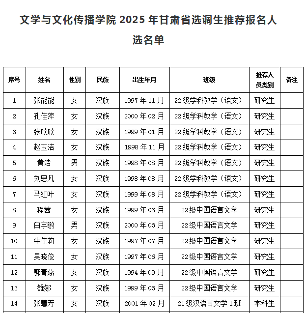 pg电子官方网站关于2025年甘肃省选调生推荐报名人选名单的公示