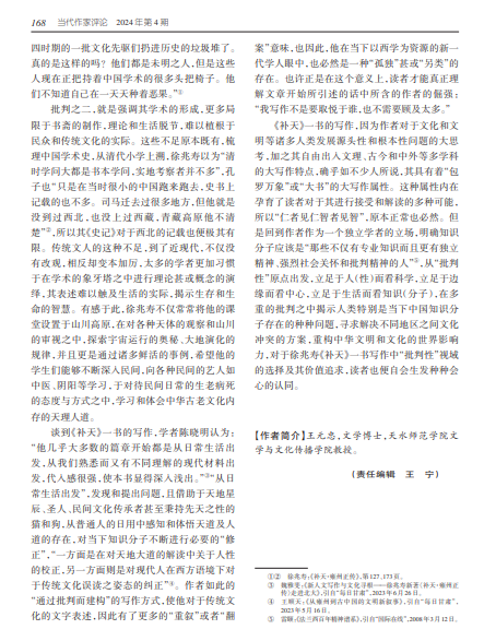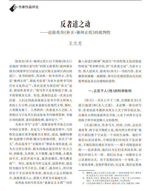 编者按:2024年4月,《当代作家评论》期刊刊发了我校pg电子官方网站教授王元忠的文章《反者道之动——论徐兆寿<补天·雍州正传>的批判性》。文章已收录于知网。全文如下: