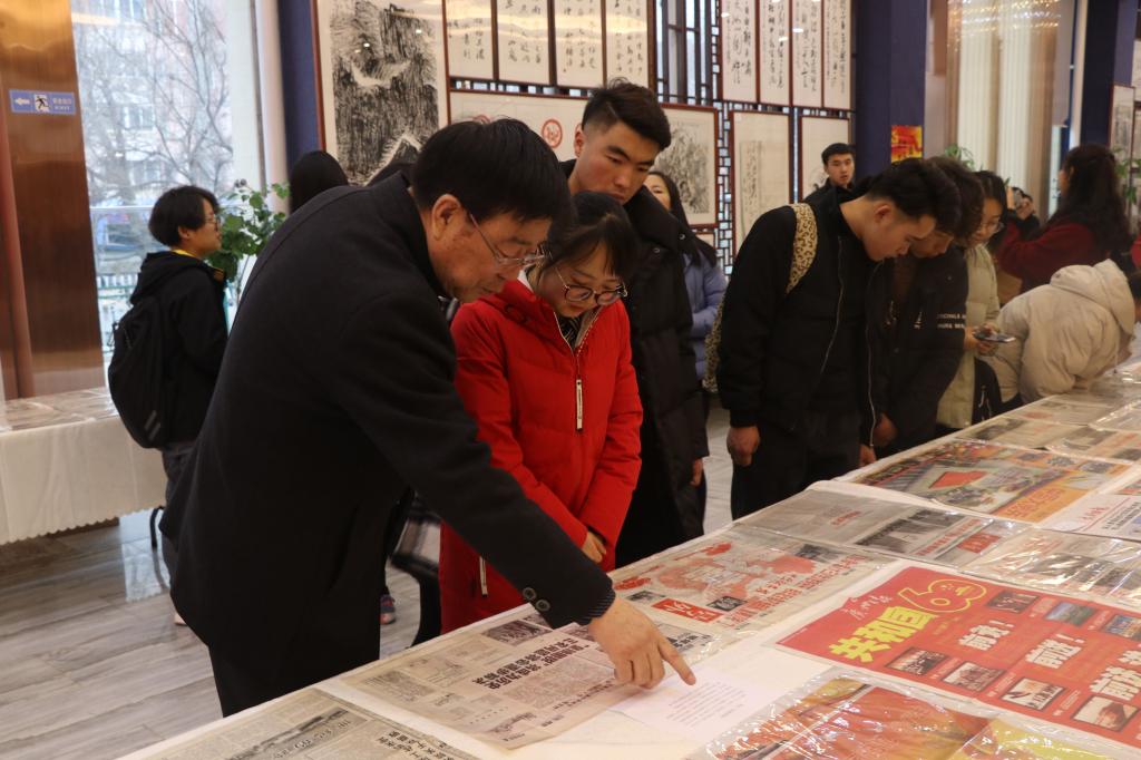 我院学生在观看展出作品时,展会负责人声情并茂的向同学们介绍各类报纸上记载的重大事件及影响。他说,报纸被称为新闻纸,它真切见证社会风云,忠诚记录现实生活,鲜活保存时代精神,为未来留下一份珍贵的历史记忆。四十年,打破禁锢,起步于贫困,却一飞冲天。回望过去,中国政治经济思想文化的诸多面貌,皆来源于这四十年的系列变革。改革开放这四十年尤其值得纪念。
