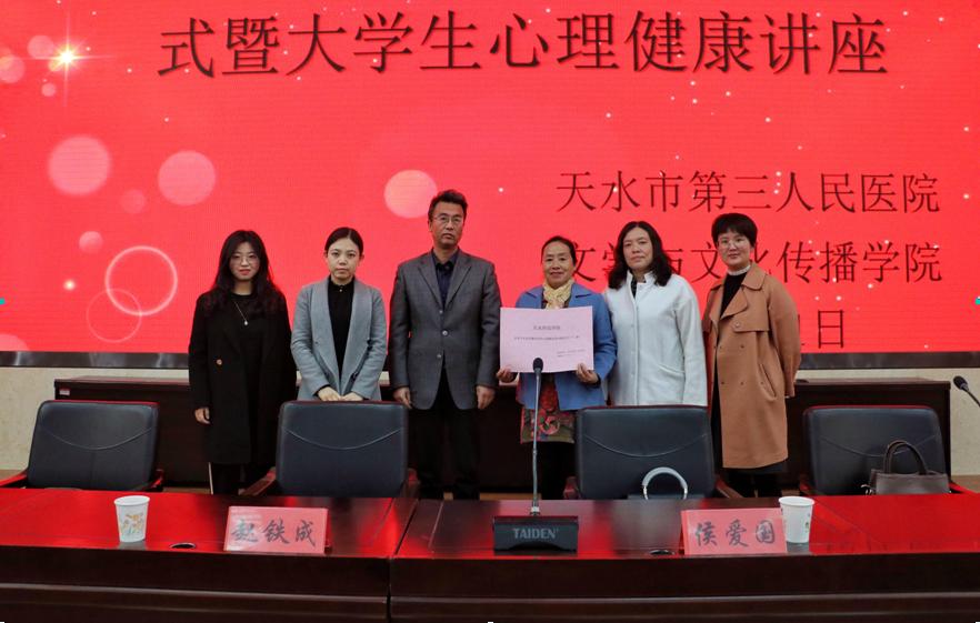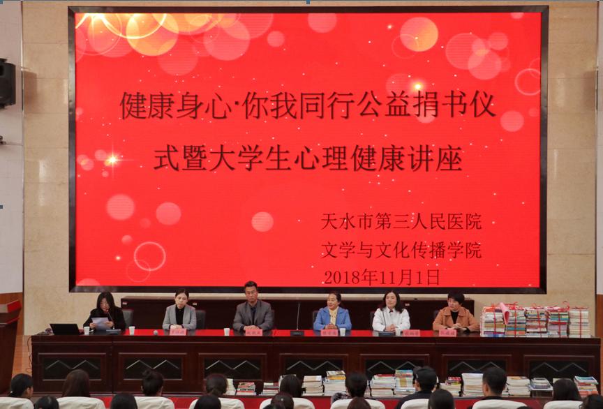 活动第一项由杜青老师阐释本次活动的主题——“幸福从心开始”。活动第二项由文传学院党总支副书记赵铁成与天水市第三人民医院副院长侯爱国女士进行图书捐赠交接仪式。pg电子官方网站于10月30日起在校园内组织捐书活动,共计捐赠书籍600本。活动第三项由天水市第三人民医院副院长侯爱国女士介绍医院概况,同时也表达了对我院师生的感谢。活动第四项由心理治疗师罗瑛婕医生做以“幸福从心开始”为主题的讲座。