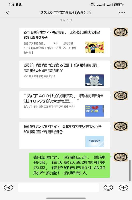 工作总结:各班积极落实防范电信网络诈骗、大学生国家安全意识和法纪意识及国家相关宗教政策警示教育精神,利用现有资源认真安排部署,积极发动本班学生踊跃参与,不断丰富活动内容,持续深入开展特色宣传活动,有效提升了学生的安全防范意识。