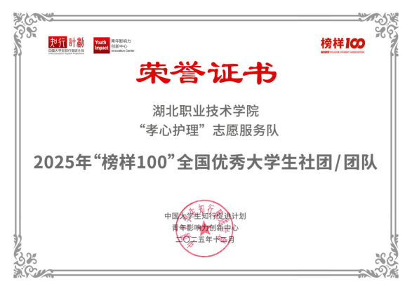 (本网讯 黄李想)近日,全国大学生知行计划”榜样100”优秀大学生社团名单正式揭晓。护理学院“孝心护理”志愿服务队凭借“专业赋能公益、青春践行孝德”的特色实践,成功跻身全国优秀大学生社团行列,不仅为学院志愿服务事业镌刻下浓墨重彩的一笔,更让青年学子的责任担当在全国舞台上熠熠生辉。
