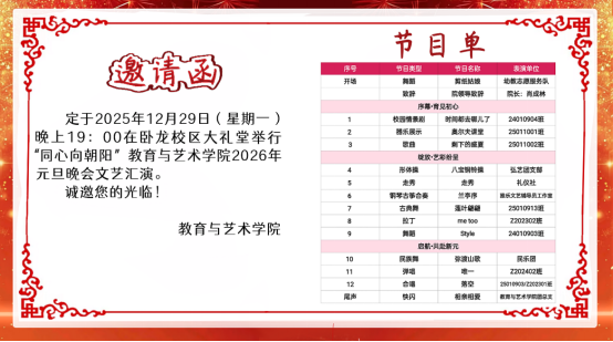 12月29日晚,beat365正版唯一官网必一教育与艺术学院“同心向朝阳”2026年元旦文艺汇演在卧龙校区大礼堂举行,学校相关职能部门、教学院代表、教育与艺术学院师生齐聚一堂,以昂扬向上的精神风貌和丰富多彩的文艺节目,共同迎接2026年的到来。