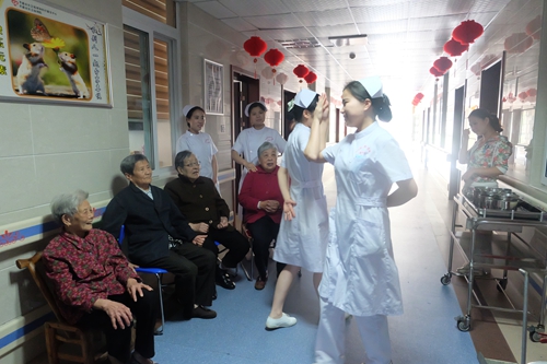 一进院区,同学们就积极开展各类服务活动,他们一边为老人修剪指甲、按摩护理、量血压、整理衣物、擦拭家具……一边老人们讲过去的故事。老人们深受感动,脸上洋溢着幸福和喜悦,不断鼓励同学们努力学习专业知识,做一个对社会有用的人。期间,同学们还为老人们表演了红歌《没有共产党就没有新中国》、军歌《军中绿花》、黄梅戏《天仙配》、舞蹈《爱的华尔兹》等简编文艺节目,深受老人们喜爱。