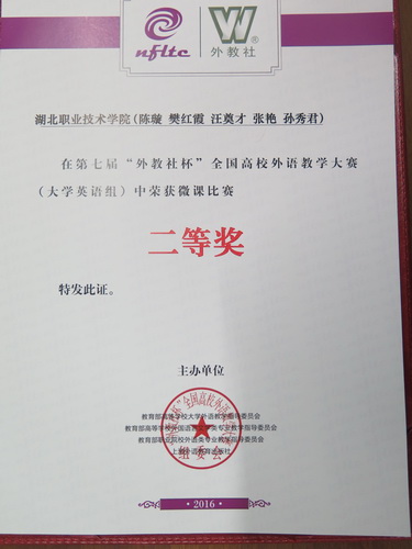 作为我国规模最大、层次最高、影响最广的外语教学专项比赛,大赛始终坚持公正、权威、严谨、务实的原则,力求涵盖高等教育英语教学从大学英语到英语专业以及职业教育的各个层面,展现我国高校外语教师教学的最高水平。第七届“外教社杯”全国高校外语教学大赛于2016年3月启动,历时半年多,全国29个省、市、自治区相继组织了分赛区的复赛和决赛,成为历届以来参赛省份最多的一次比赛。本届大赛分为大学英语组和微课组的比赛。外语学院以陈璇为负责人的团队精心制作的微课从全国250多所本专科院校中过关斩将、脱颖而出,喜获全国二等奖(全国总排名第五,全国高职高专类院校第一)。