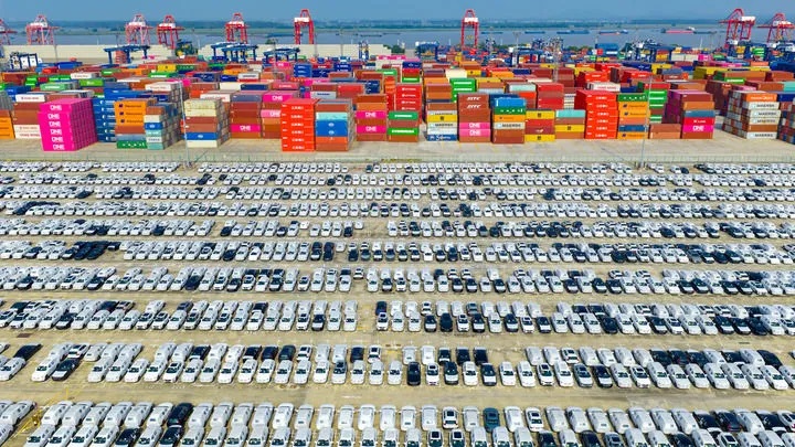 2025年10月4日在江苏省港口集团南京港龙潭港区拍摄的准备装船出口的汽车(无人机照片)。新华社发(杨素平摄)